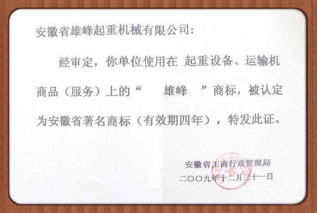 - 雄峰被評(píng)為安徽省著名商標(biāo)