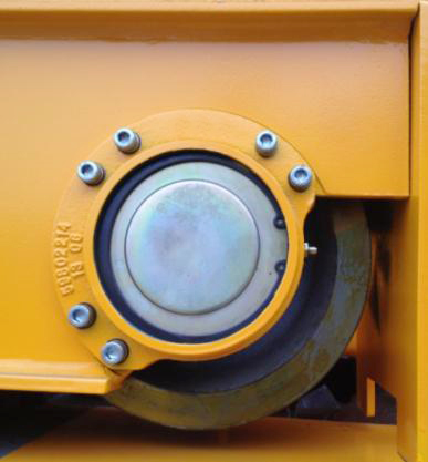 5.柔性端梁,即車輪組之間由鉸接梁柔性連接,數(shù)控加工保證4個(gè)車輪直線度和垂直度,對(duì)車間地基等原因?qū)е萝壍雷冃尉哂辛己米赃m應(yīng)性,消除了三條腿、啃軌、跑偏等現(xiàn)象,輪壓均勻、運(yùn)行平穩(wěn)。