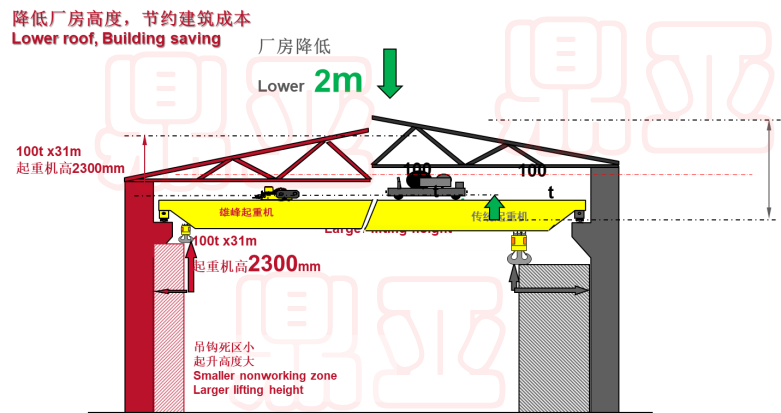 歐式行車(Euro overhead crane)起升小車由小車端梁(end beam)、承載梁、起升模塊組成,起升模塊為起升電機(jī)、減速機(jī)、制動器、卷筒四合一獨(dú)特的集成化結(jié)構(gòu)。相比較于傳統(tǒng)的電動葫蘆,整臺起升小車結(jié)構(gòu)緊湊、低凈空設(shè)計,降低高度和減輕自重,比蘇式矮1-2米,降低廠房高度,節(jié)約建筑成本。